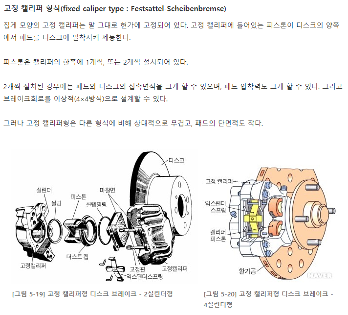 네이버의 설명대로 부품수가 적고 가볍고 정비가 용이합니다. 그래서 대부분의 순정차량에 적용된 디스크브레이크는 이런 방식을 사용합니다.