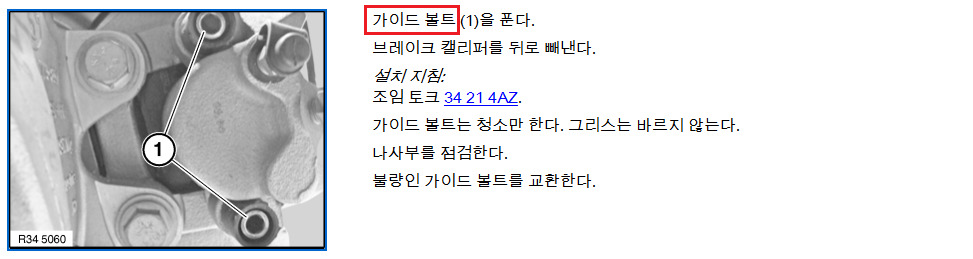 위 설명은 네이버에 있는 브레이크 설명을 캡쳐했는데 BMW의 ISTA+에서는 가이드볼트라고 설명되어 있지만 네이버에는 가이드 핀이라고 되어있는데 동일한 방식이고 표현의 차이입니다.