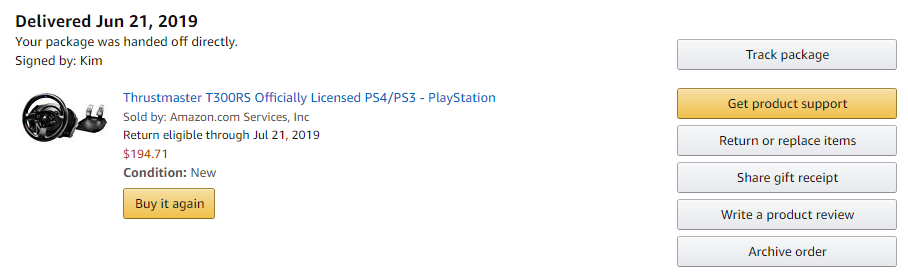 2페달 제품을 구매한 이유는 3페달인 T300RS GT의 경우 $200이 넘기때문에 관세가 붙지 않더라도 부가세가 붙기때문에 가격이 올라가는 이유가 있었고 T300RS GT에 포함된 T3PA의 페달의 경우 로지텍 G29 제품보다 평이 좋지 않아서 T3PA가 아닌 T3PA PRO를 별도로 구매하려고 2페달 제품을 구매했습니다.
