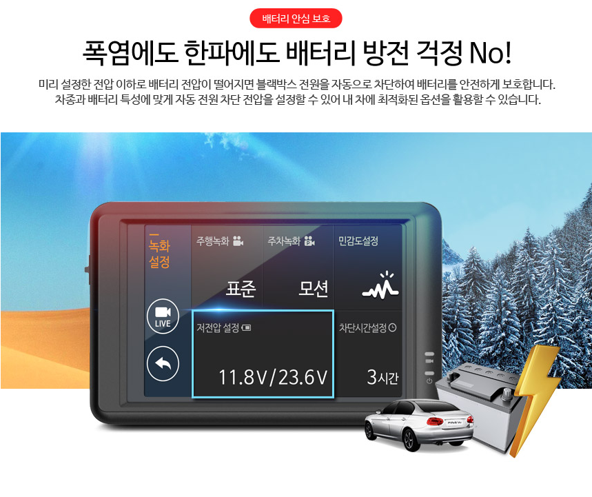 파인뷰의 저전압 설정은 X2000의 경우 정해진 몇개의 설정값에서 선택을 해야했는데 타 제품의 경우 0.1V 단위로 설정이 가능한 제품이 있더라구요. 더 세세하게 설정 가능한게 좋지 않을까 생각되는데 기존과 똑같은지 한번 확인해봐야할것 같습니다.