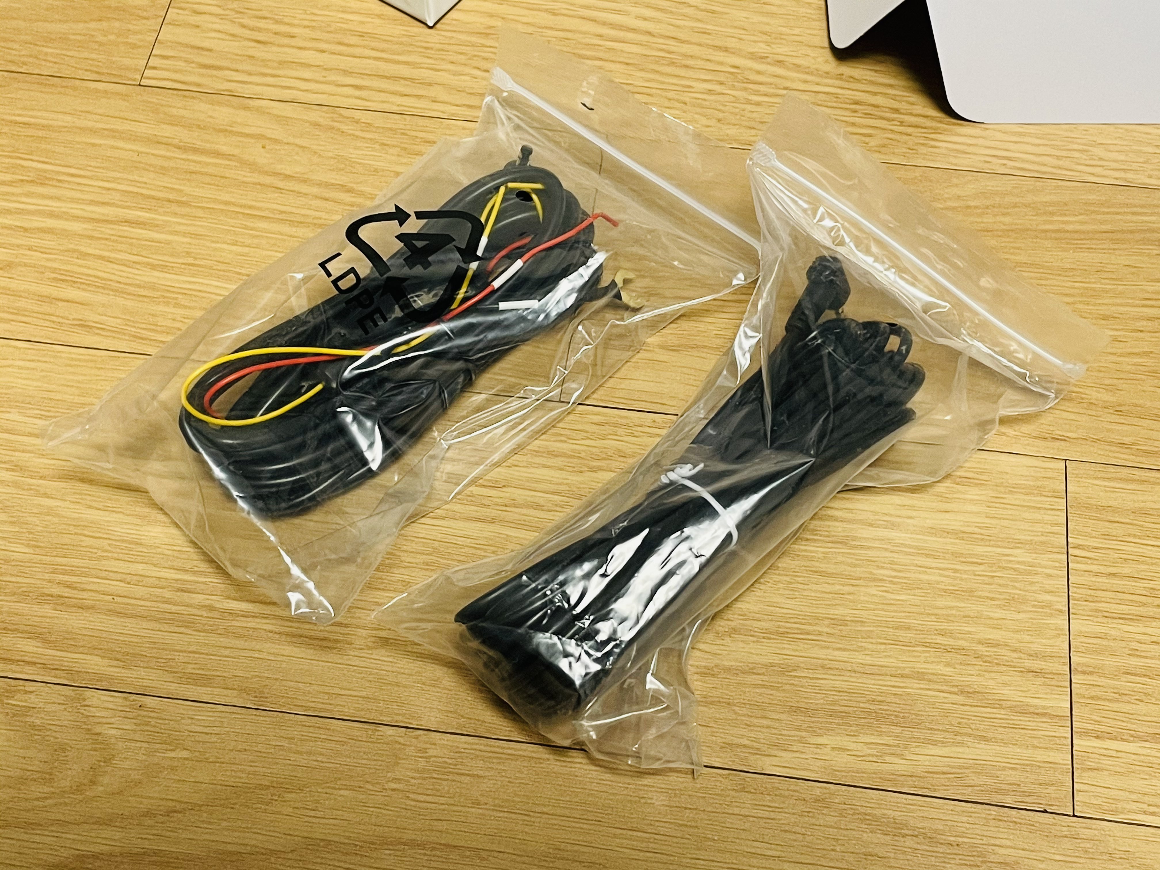 구성품은 전원케이블과 전방-후방 카메라 연결 케이블이 들어있습니다.