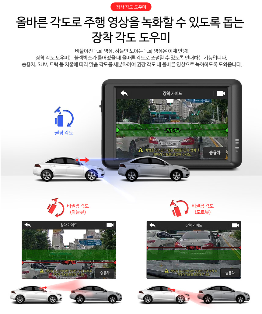 블랙박스를 자가설치하는 경우 차량의 유리 각도가 다 다르기 때문에 적당한 각도로 촬영되도록 조절을 해줘야하는데 이때 도움이 되는 가이드 기능을 제공하고 있습니다.