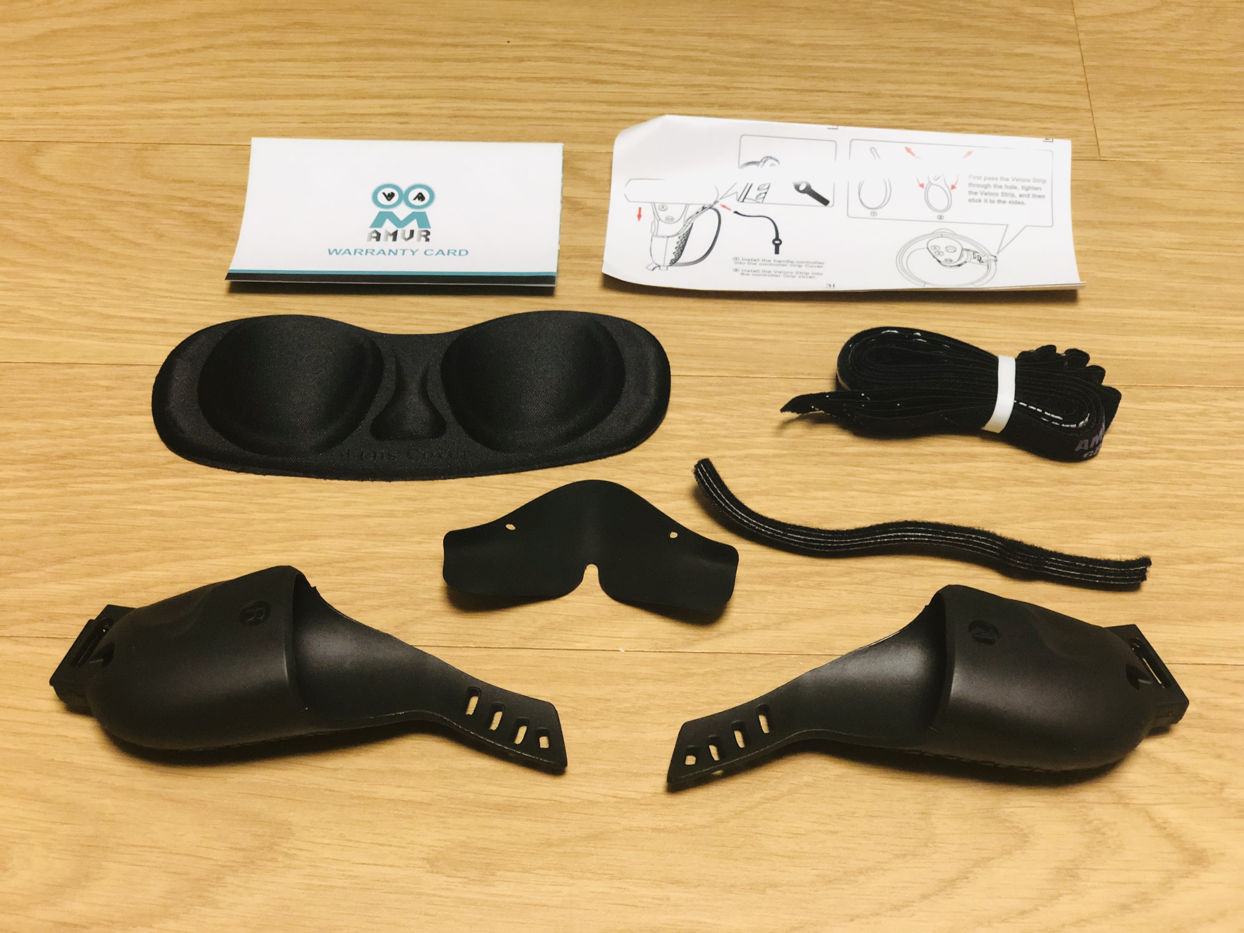 좌우 그립과 스트랩 4개(2개는 여유분), 그립 고정용 벨크로 밴드 4개(2개는 여유분), 퀘스트용 빛샘방지 코패드, 렌즈 커버, 메뉴얼, 보증서가 들어있습니다.