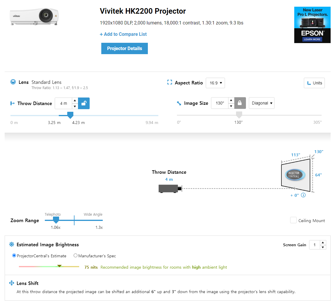 참고로 거실 천정에 설치한 프로젝터와 130인치 스크린의 거리는 약 4m고 줌링은 거의 돌리지 않아도 130인치 스크린을 꽉 채워줍니다. 1.3배 줌기능을 제공하는데 1.06배의 줌으로 4m거리에서 130인치 화면을 채울 수 있다고 나옵니다.