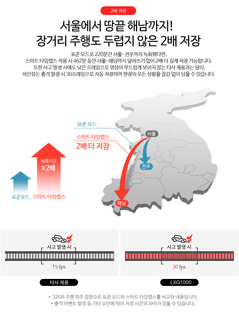 타임랩스라는게 프레임을 떨어트려 녹화하는 방식인데 설명 이미지로만 보면 고정프레임으로 찍지 않고 평상시에는 15fps로 녹화를 하지만 사고발생시 30fps으로 찍혀서 사고시의 상황을 더 자세하게 녹화하는 방식이라 동일 메모리에 녹화시간을 2배정도 향상시키는 기술인것 같습니다.
