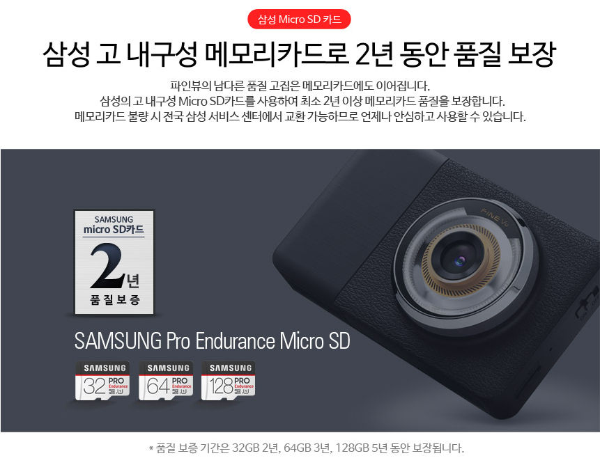 보통 블랙박스를 구매하면 자체 로고를 프린팅한 Micro SD 카드를 제공하는데 파인뷰는 삼성 Pro Endurance Micro SD카드를 기본으로 제공하여 메모리 에러에 대한 대비를 하고있습니다.