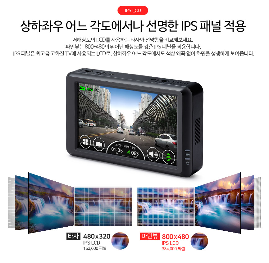 블랙박스의 액정이 크다면 전방 시야를 조금 가릴수도 있기에 저는 작은 액정을 선호하는데 3.5"라도 충분히 크다고 생각되고 이정도 크기의 액정에는 800X480의 해상도면 충분히 선명한 화질을 제공해줍니다.