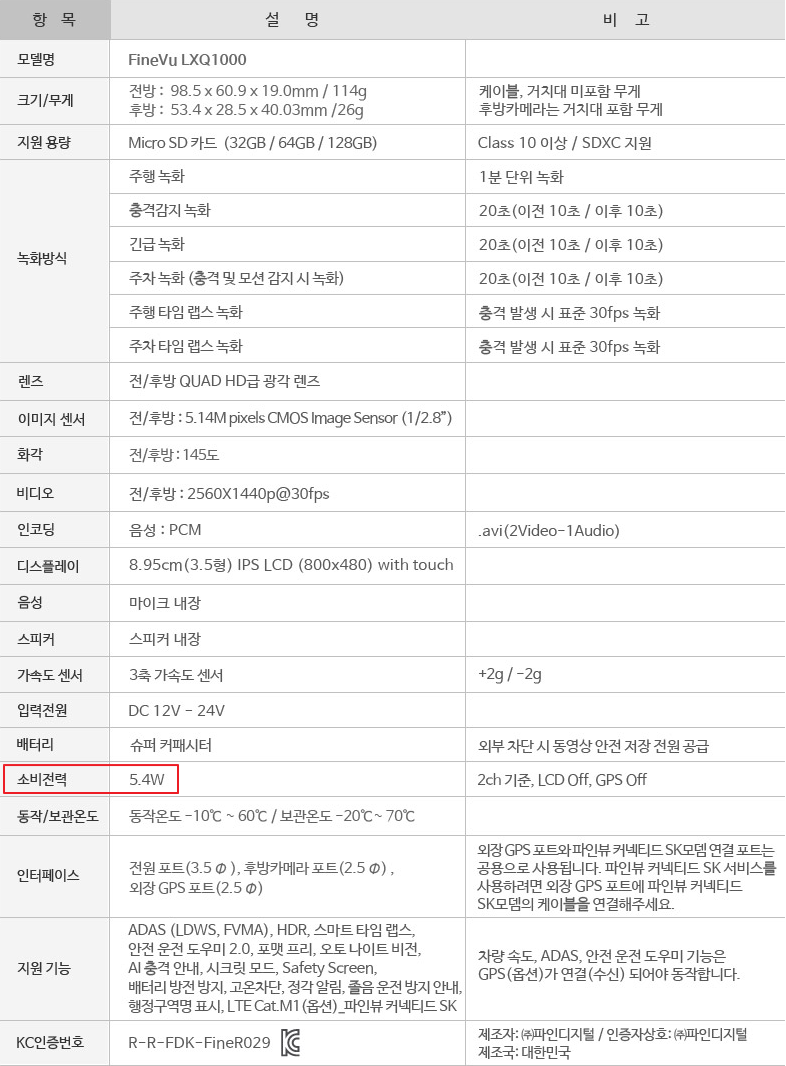 이럴때 중요한게 주차녹화시 소비전력인데 LXQ1000은 소비전력이 5.4W입니다. 다른 FHD 블랙박스를 보면 3W 후반대에서 4W 초반대를 보여주는데 QHD의 화질을 지원하다보니 소비전력이 조금 높은것 같습니다.