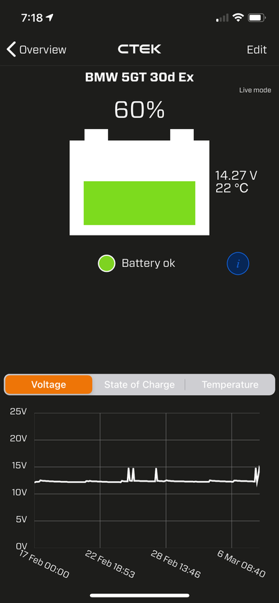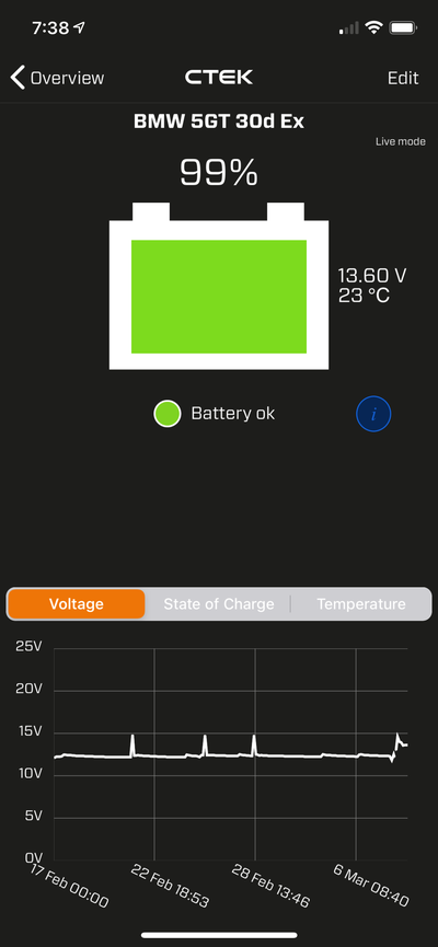 실제로 전압은 정확하게 13.6V로 측정되었고 충전량은 99%를 찍고있습니다.