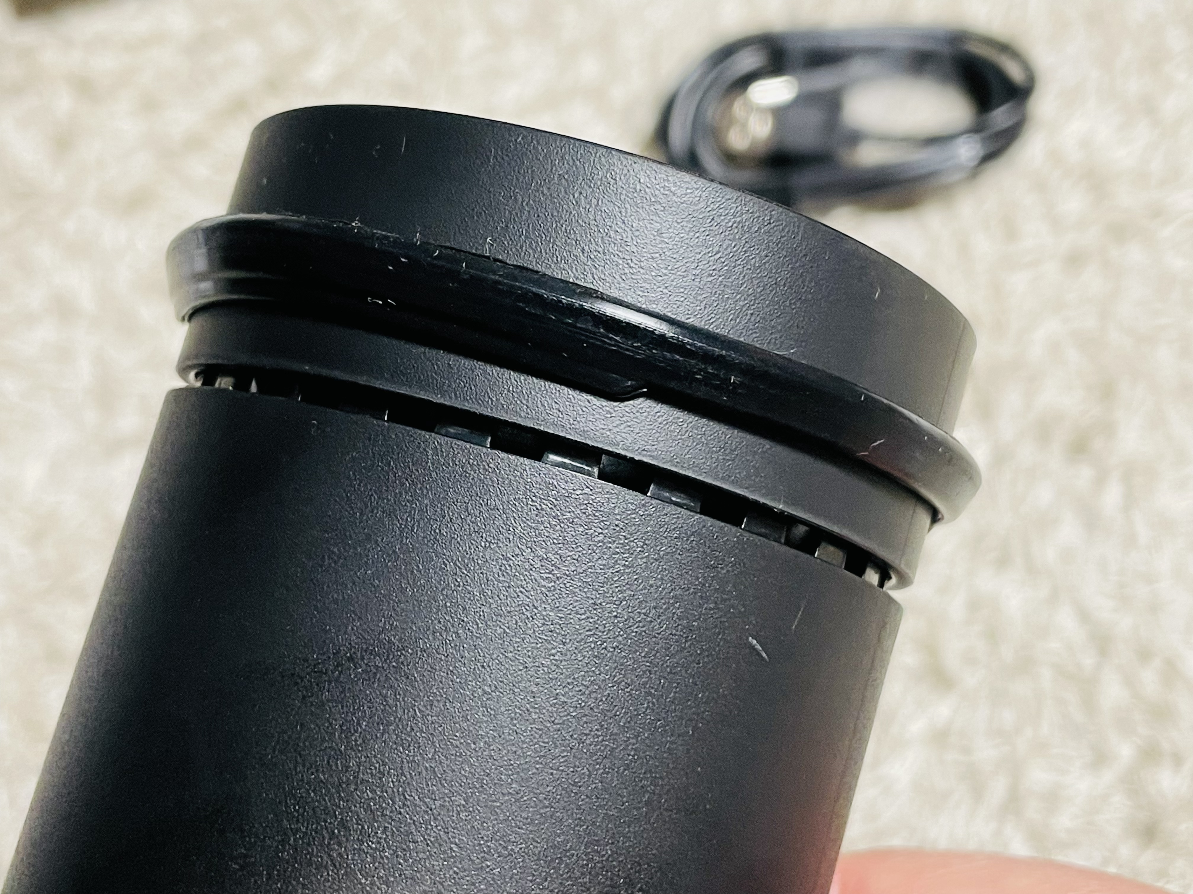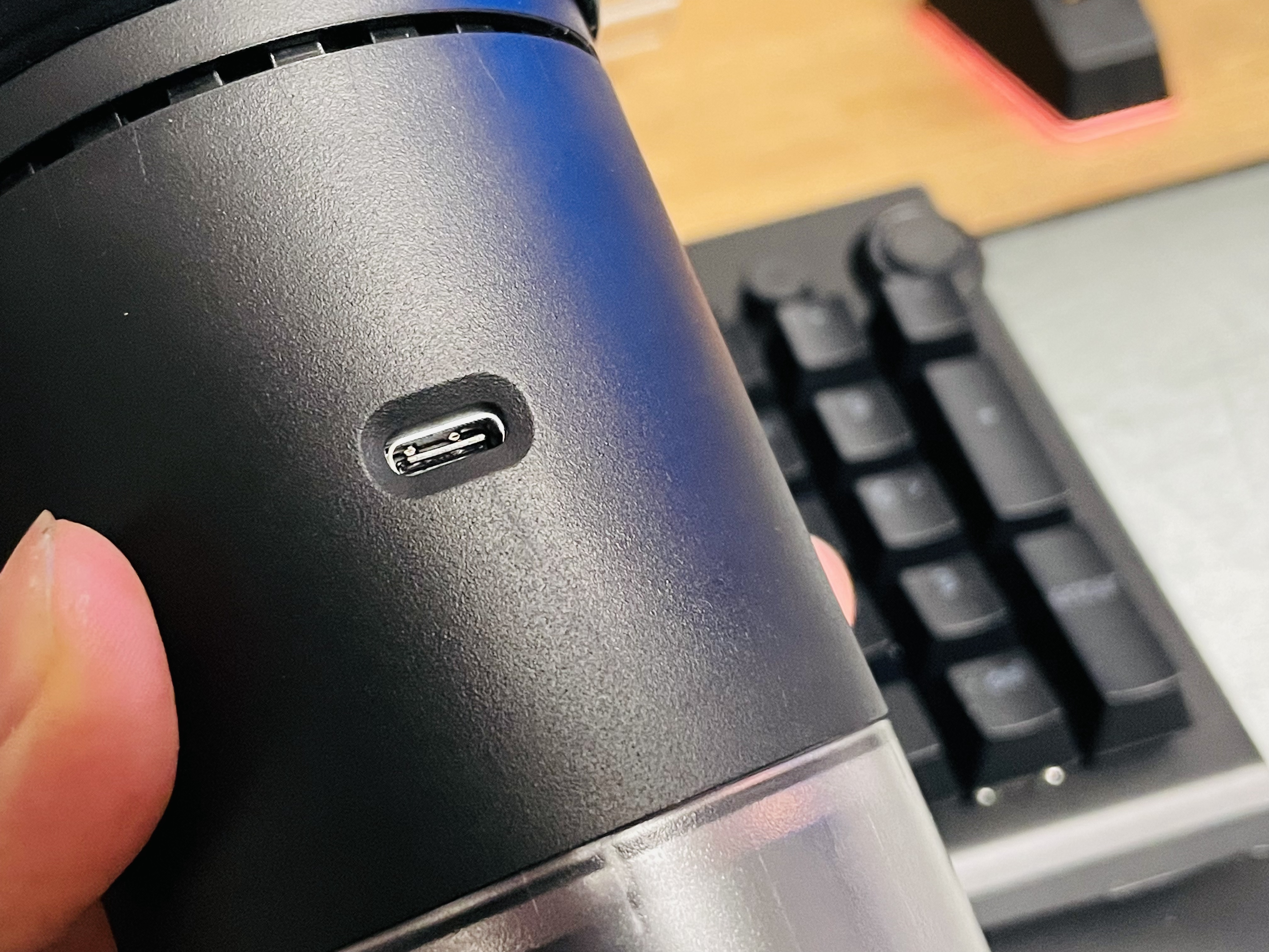 본체에 USB 케이블을 연결해서 충전하면 아래쪽에 빨간색으로 등이 들어옵니다.