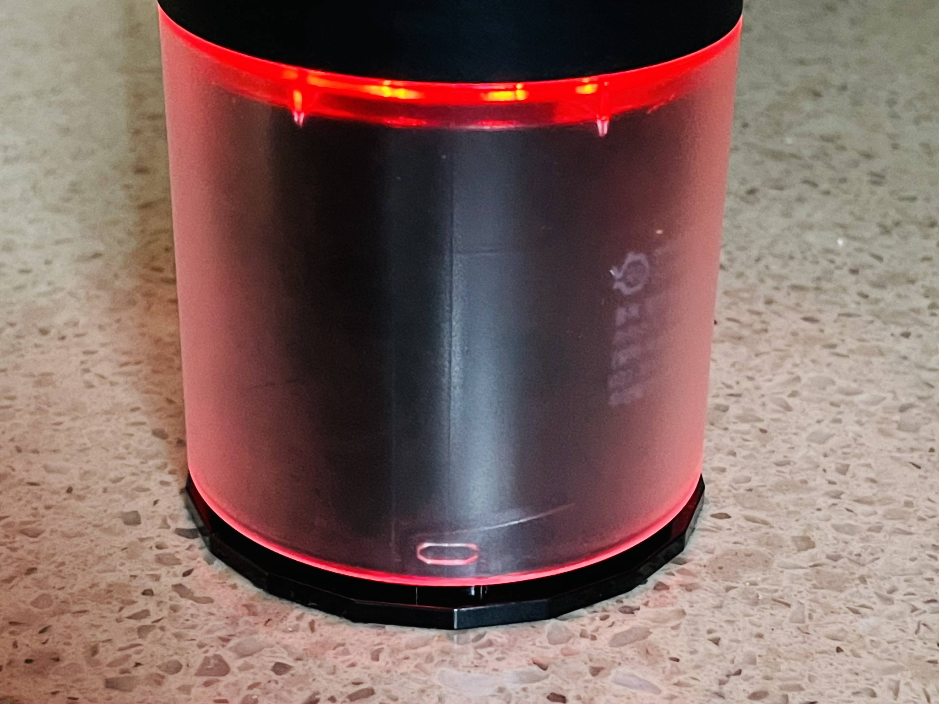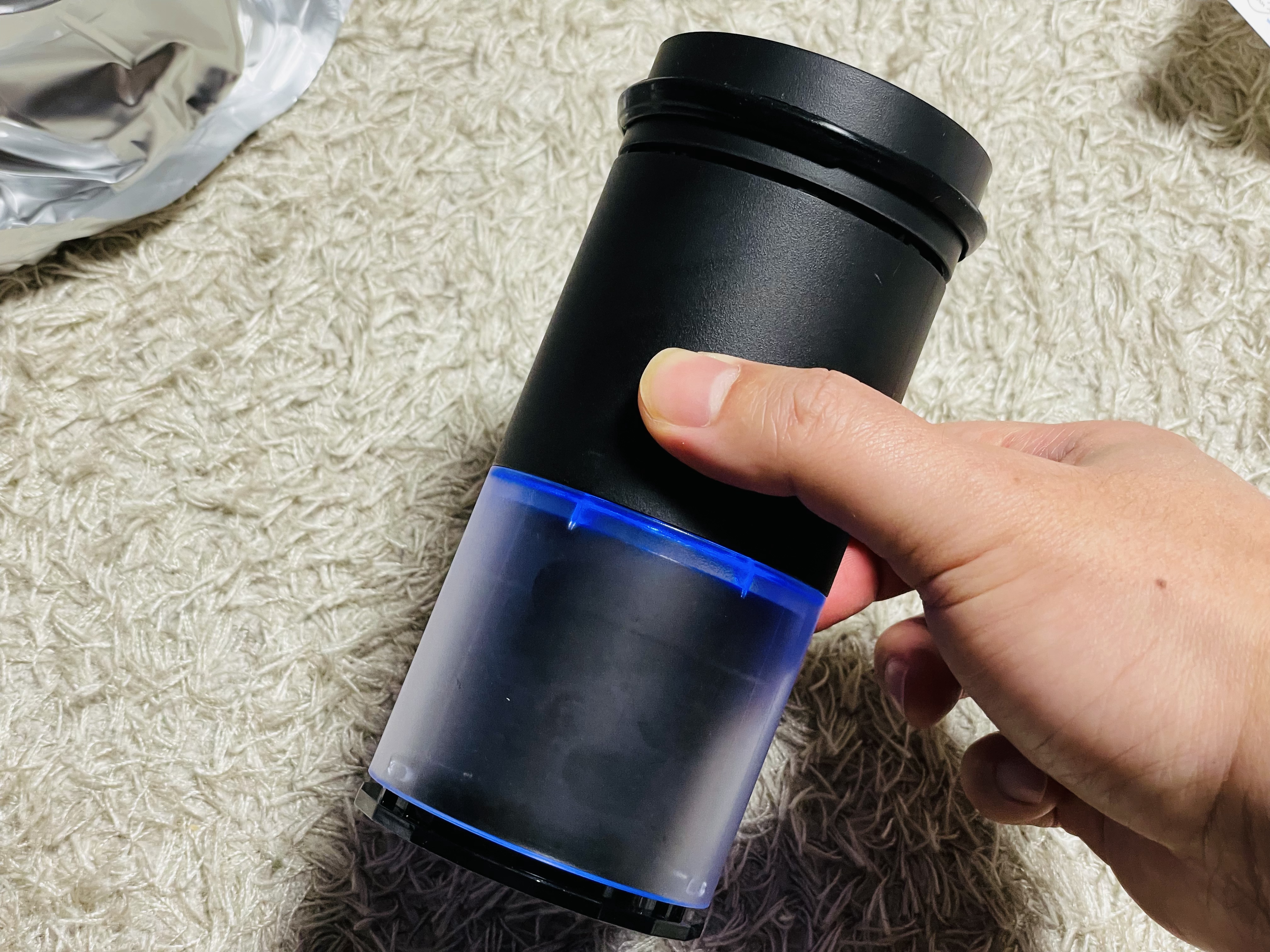 제품 윗면을 1~2초정도 꾹 눌러서 전원을 키면 이렇게 아래쪽 반투명한 부분에 파란색 조명이 들어옵니다.